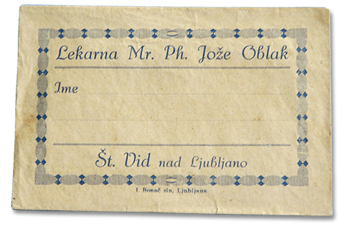 After the war, Josef continued his education. Due to his great interest in medicinal plants, he decided to study pharmacy in Zagreb, which he successfully completed in 1923. After finishing school, he first worked in various pharmacies in Ljubljana, the longest in Trnkocy. He finally opened his pharmacy only in 1932, when the Chamber of Pharmacists granted him a license. Initially, the pharmacy was located in the basement of the building next to the old post office, but in 1939 Celovska street was paved and the pharmacy moved to the first floor of the new Bevant House. Before the pharmacy was opened in Sentvid, the residents of the surrounding area were supplied with medicines in the pharmacy in St. Rok in Siska (area in Ljubljana).